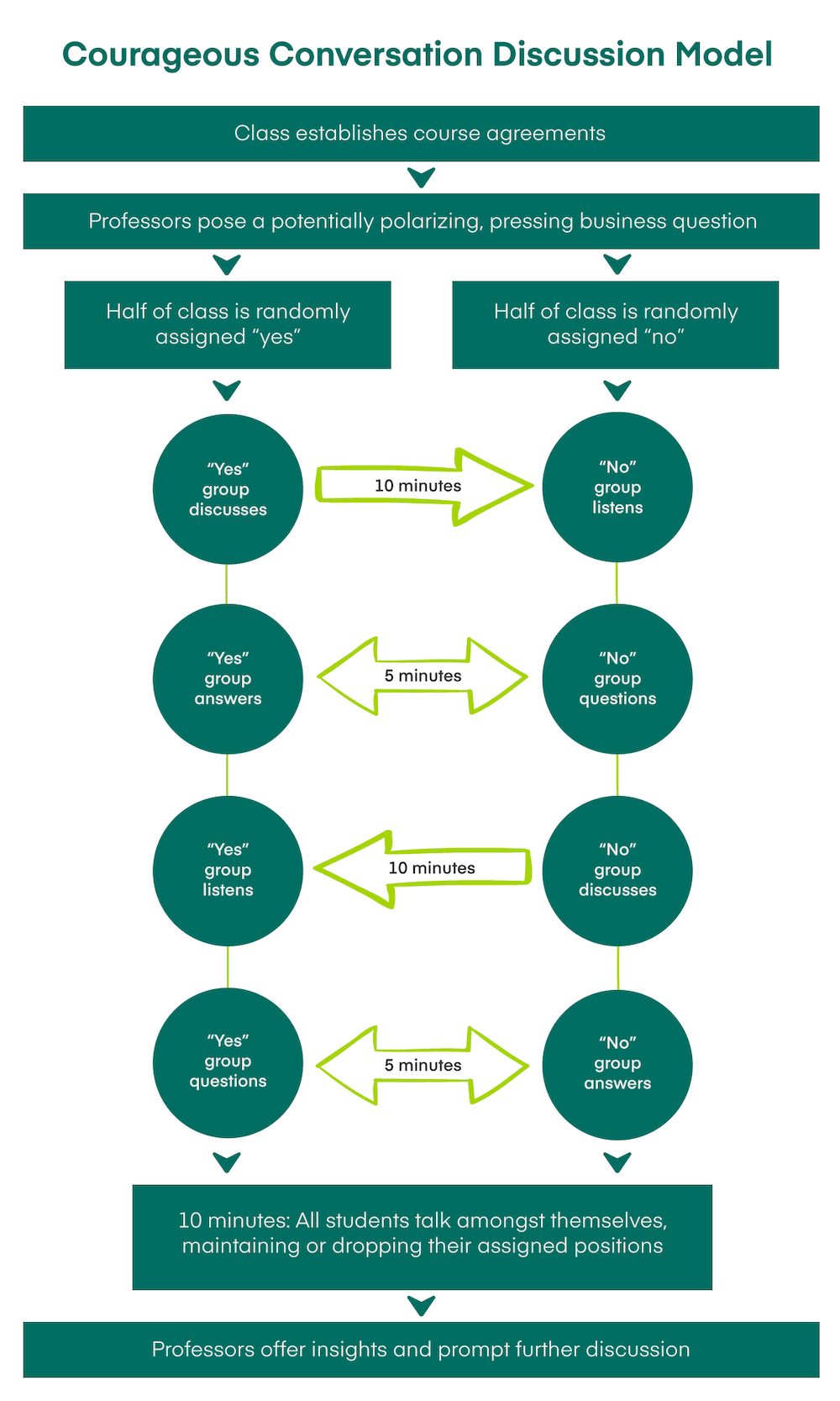 To prepare for the conversations, students must complete assigned readings representing divergent perspectives on polarizing topics. We also encourage them to gather their own business intelligence, collect evidence in support of their assigned positions, and predict counterpoints.